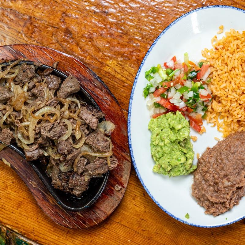 Select beef ribeye topped with onions, served with rice and refried beans. Garnished with a side of guacamole and pico de gallo. Include grilled shrimp for our version of surf and turf.