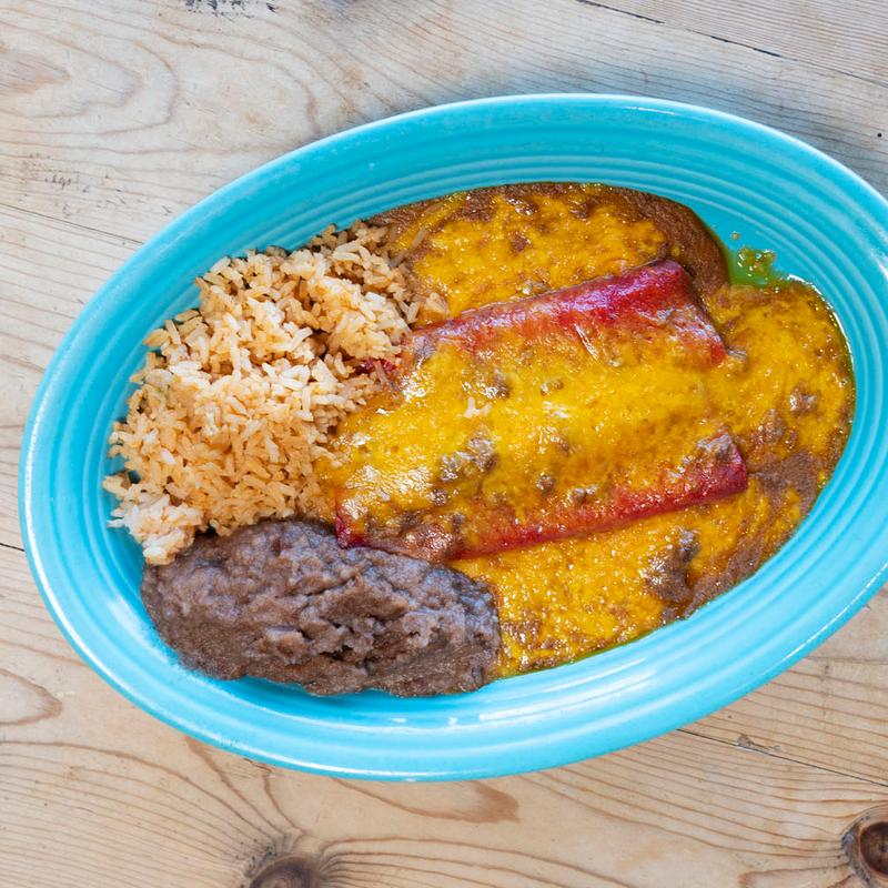 Three cheese enchiladas topped with chili con carne. Served with rice and your choice of beans.