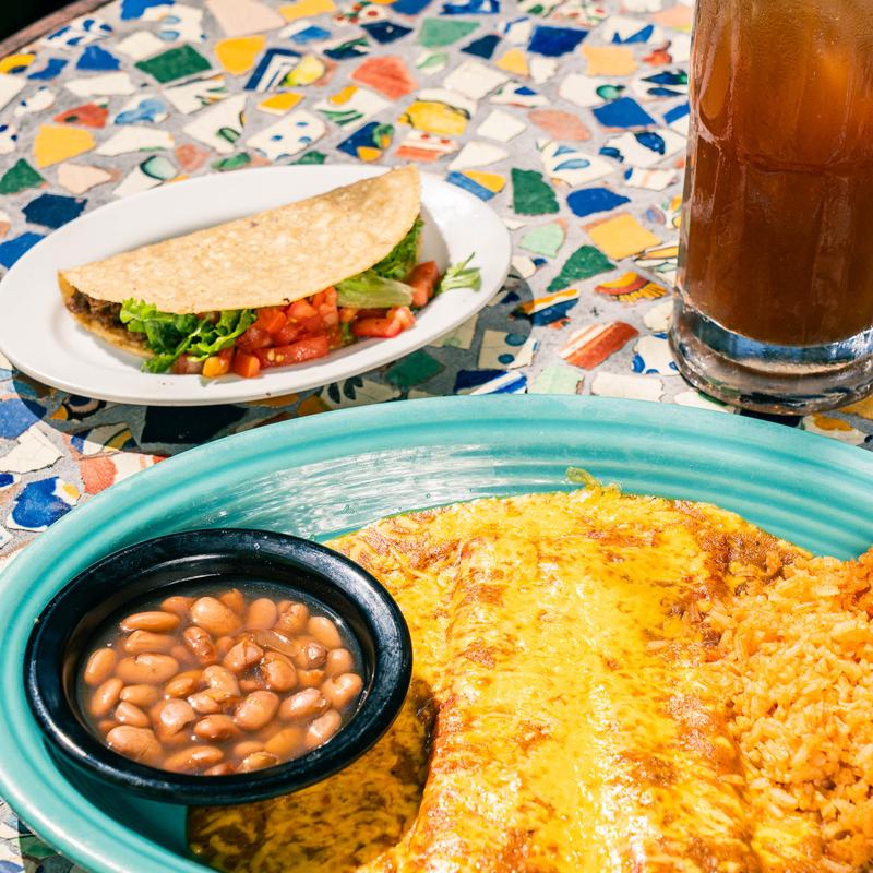 Two cheese enchiladas topped with chili con carne and one crispy picadillo taco. Served with rice and any choice of beans.